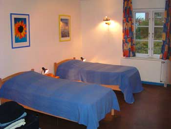 Dreibett-Zimmer im Erdgeschoss. Viel Platz für Rollstuhlfahrer.