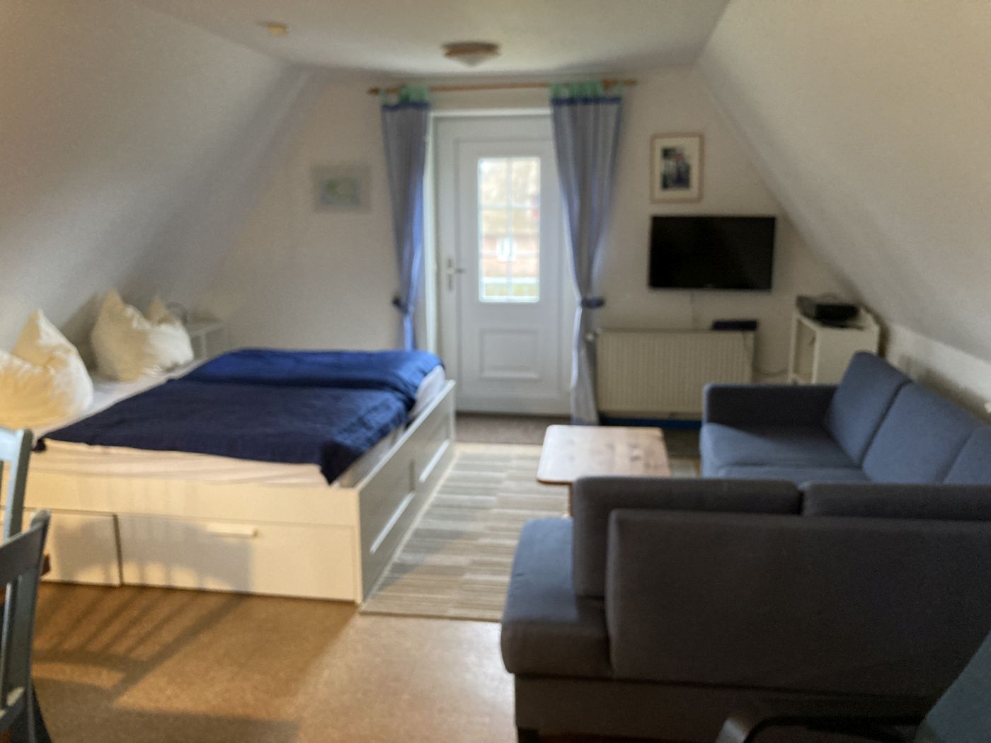 Das Apartment im Obergeschoss beherbergt maximal 4 Personen. Ausgestattet ist es mit einem Doppelbett, Schlafcouch und Zusatzbett.