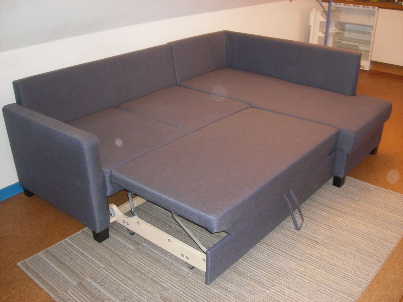 Hier sehen Sie das Schlafsofa mit ausgeklapptem Zusatzbett und heruntergenommenen Rückenpolster.